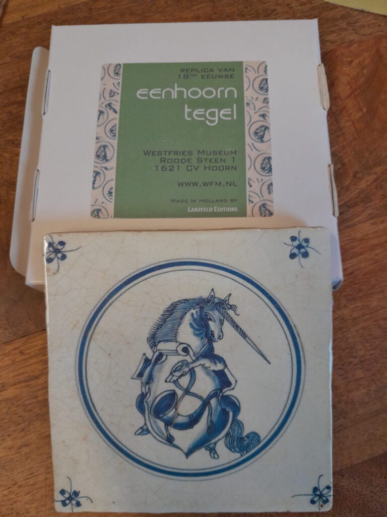 Foto’s: links: De Eenhoorntegel van de Gemeente Hoorn; midden: Burgemeester J. Nieuwenburg overhandigd de Eenhoorntegel aan voorzitter Ton Heyboer; rechts: bestuursleden Ton Heyboer, René Visser en Jef van der Zel praten nog wat na met burgemeester J. Nieuwenburg.